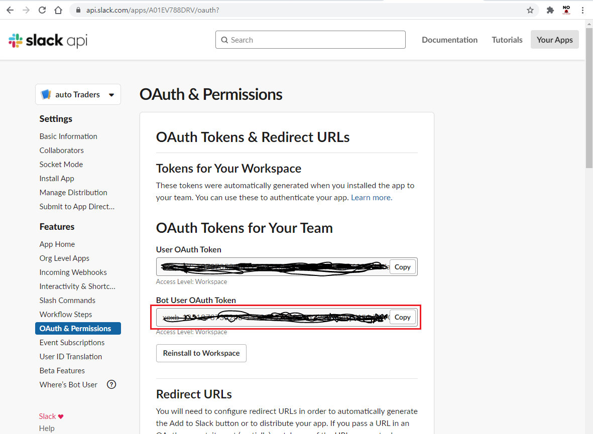 하기 화면 메뉴에서 Bot User OAuth Access Token 값을 Copy합니다.