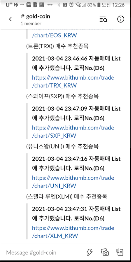 Status, 추천종목정보, 자동매수 매도 결과를 자신의 Slack 메신저로 보내주기 위해
