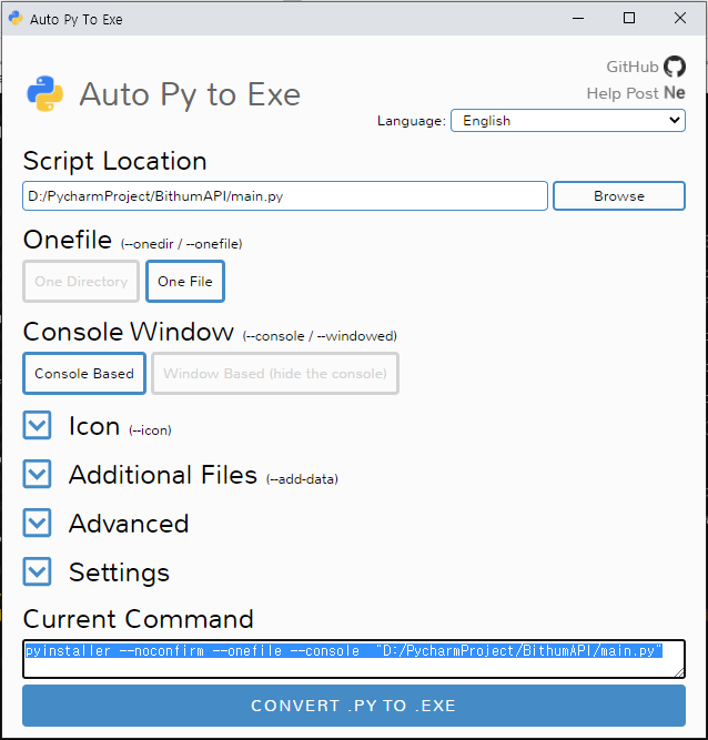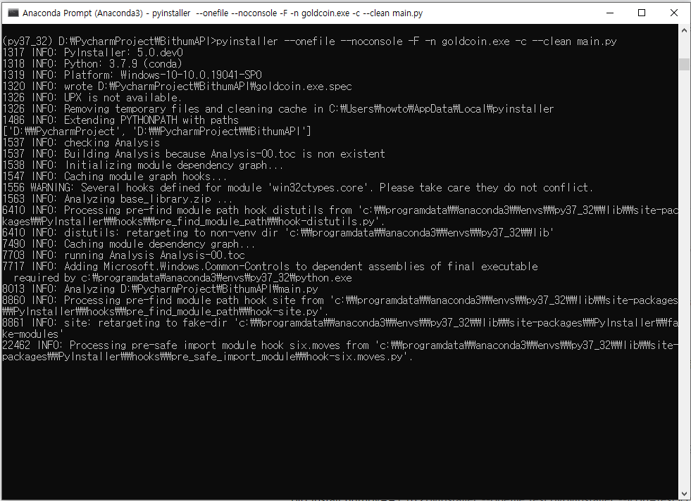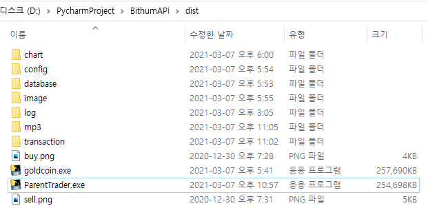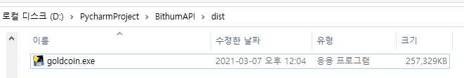 D:\PycharmProject\BithumAPI\dist 여기에 goldcoin.exe파일이 잘 만들어져 있네요.