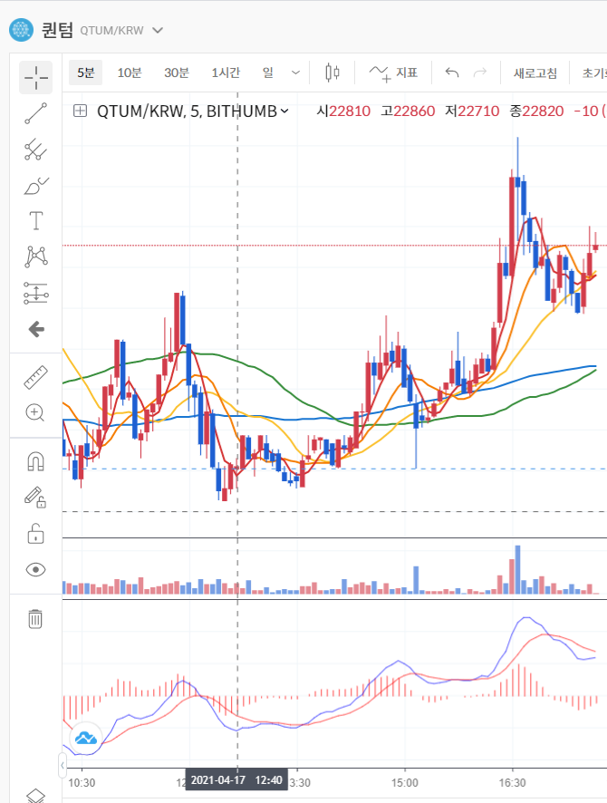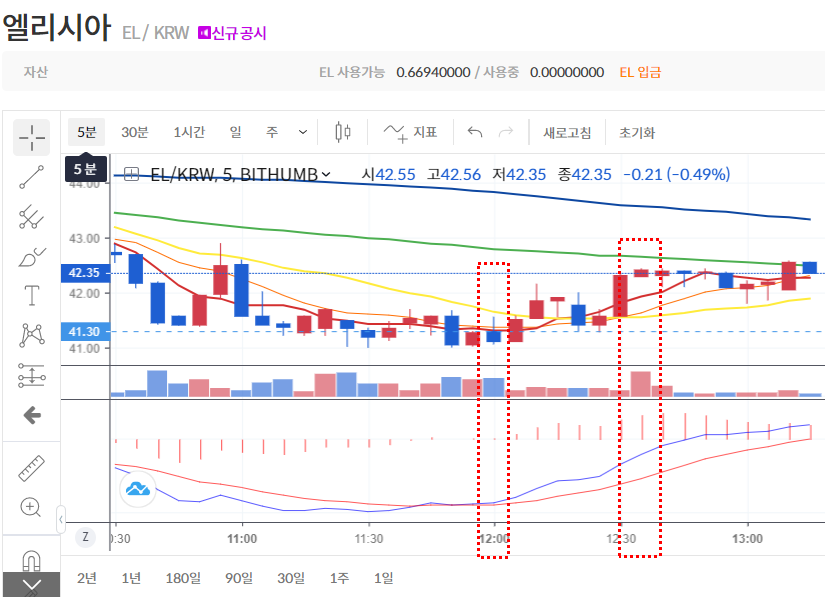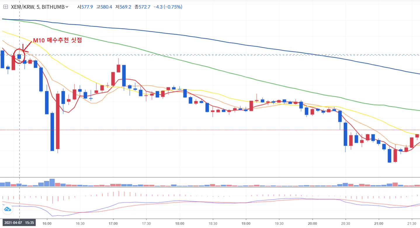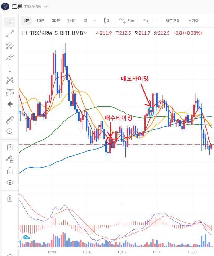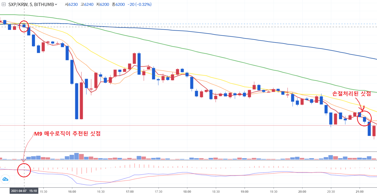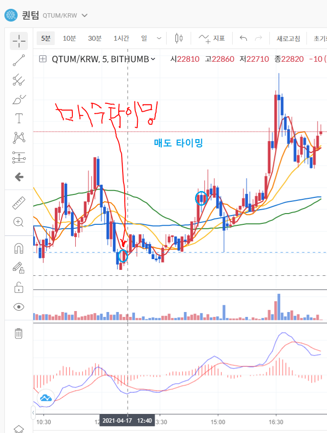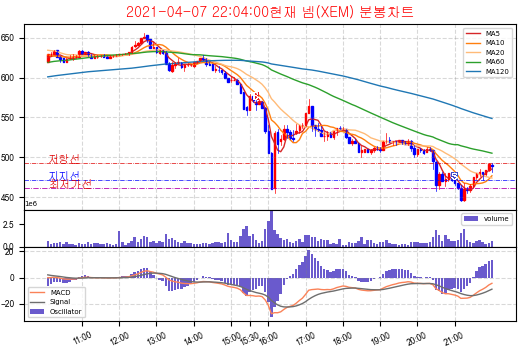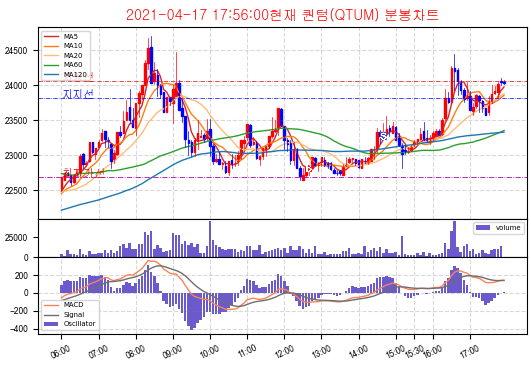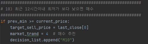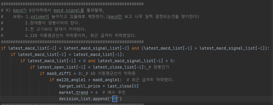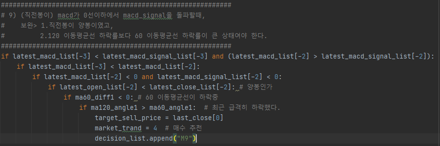 ####################################################################################### # 9) macd_osc가0선이하에서 최저점을 돌아설때(최저가도 최저점을 돌아선다)(거래량도 점차 주는 현상이 있음) # macd와signal이0선 아래에 있어야 한다.단, 60이평선은 하락상태이며, # 양봉,음봉 상관없이,전전전봉부터 현재봉까지 최저가가 꾸준히 상승하고 # 또한, macd도 전봉을 기준으로 감소에서 증가로 돌아설때가 현재 매수타이밍이 된다. #######################################################################################