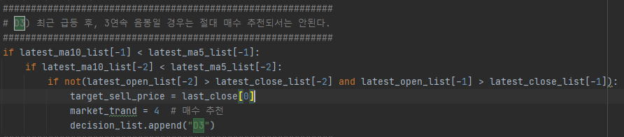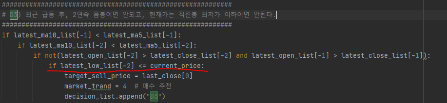 ####################################################################################### # 8) macd_osc가0선이하에서 최저점을 돌아설때(최저가도 최저점을 돌아선다)(거래량도 점차 주는 현상이 있음) # macd와signal이0선 아래에 있어야 한다.단, 60이평선은 하락상태이며, # 전전봉은 음봉이고,현재봉은 양봉이면서,전봉이 최저점을 찍고 상승전환하는 현상을 로직에 반영함 # 또한, macd도 전봉을 기준으로 감소에서 증가로 돌아설때가 현재 매수타이밍이다#######################################################################################