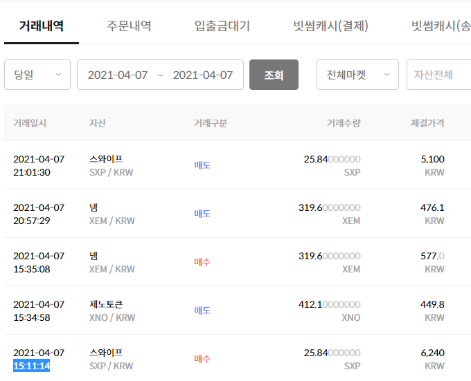 오늘 거래내역의 일부인데, 스와이프를 15:11분에 6,240단가에 매입했다가