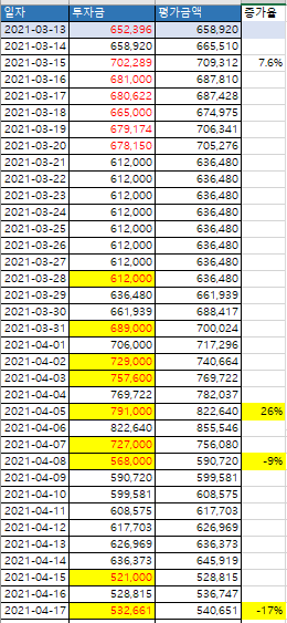투자원금에서 -9%이네요. 한때는 26%까지 수익을 올렸었는데, 지금은 마이너스 입니다.