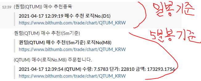 곧바로 5분봉에 의해서 다시 매수추추천되어 바로 매수주문이 들어간 Slack 메세지 내용입니다.