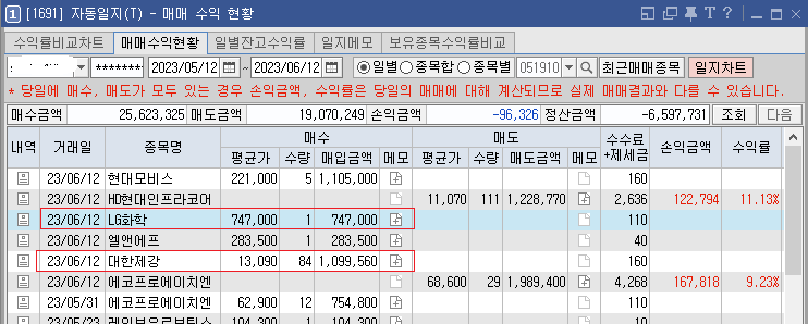 이전글에서 12일 월요일에 추천된 종목중에서 오늘은 대한제강과 LG화학이 자동매수되었습니다.