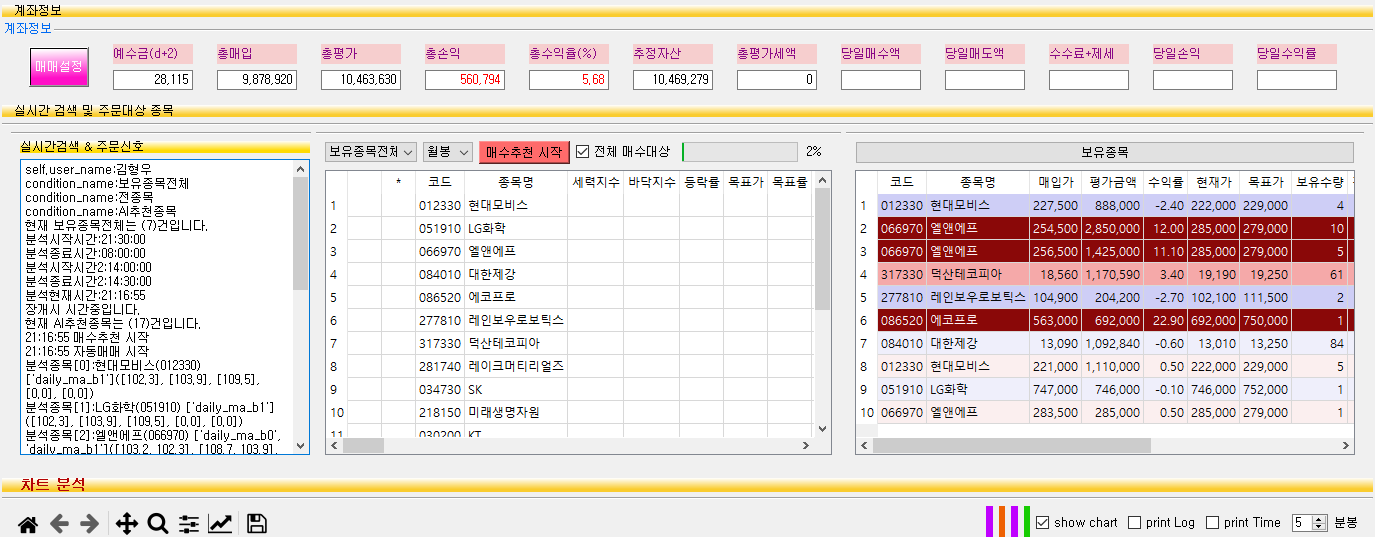 오늘의 추천종목중에서 대한제강(daily_ma_b1)과 LG화학(daily_ma_b1)이 프로그램에 의해서 자동 매수되었습니다.