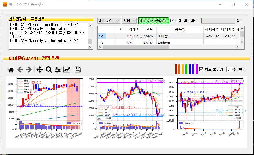 위의 미국주식 투자종목찾기 프로그램은 세력지수와 바닥지수만을 종목별로 계속 재계산하여